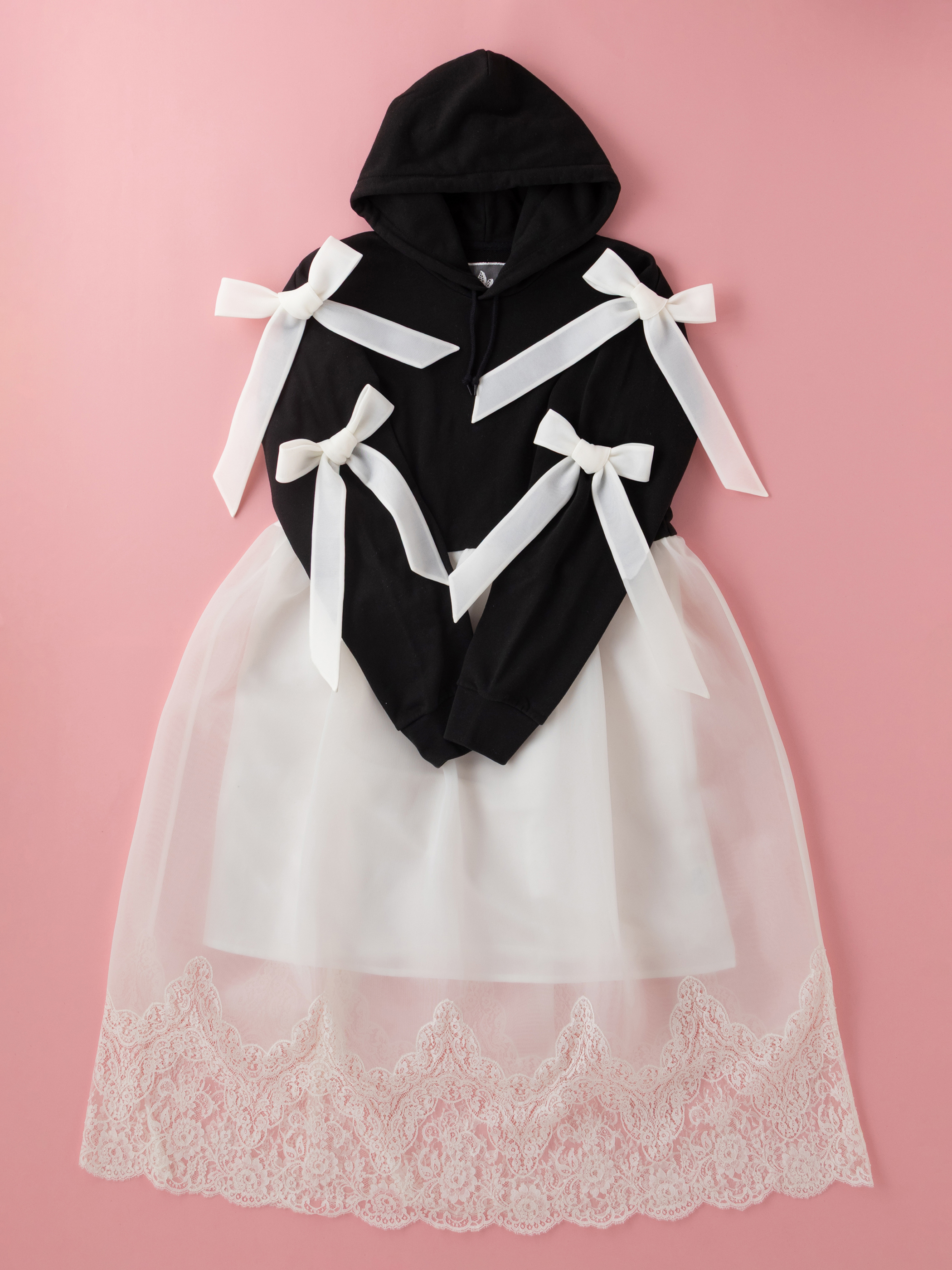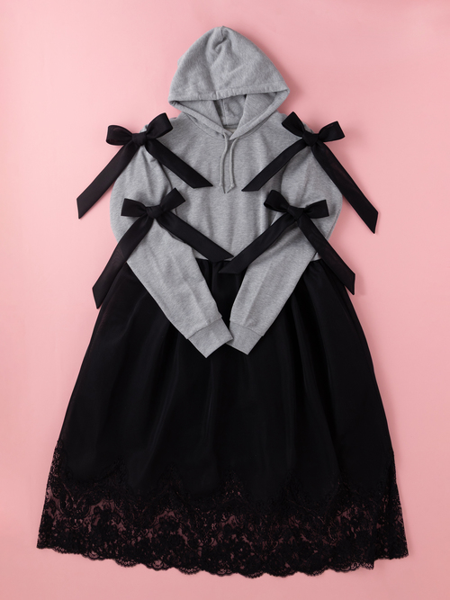 カジュアルなフーディーとたっぷりボリュームのあるスカートをドッキングさせた、日常もドラマティックに変えるドレス。裾にはフランス産リバーレースをふんだんにあしらい、overlaceらしい繊細な印象に仕上げました。