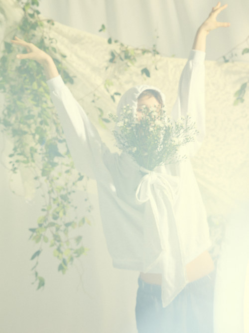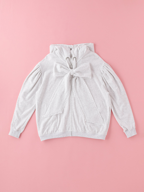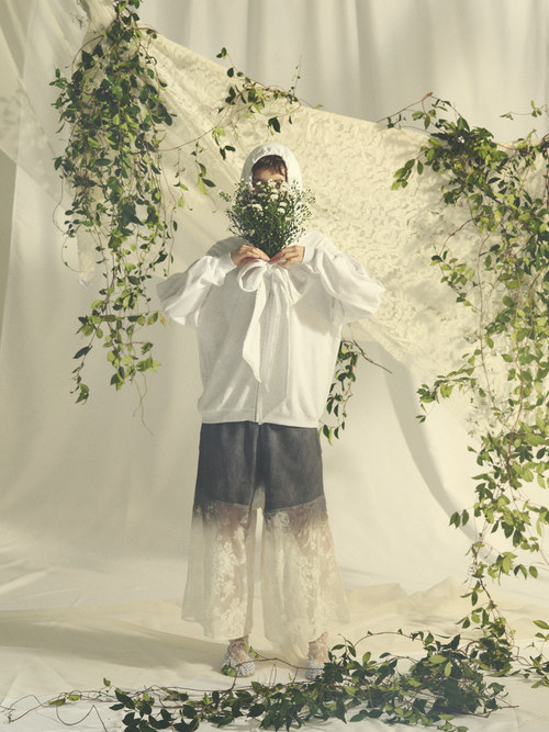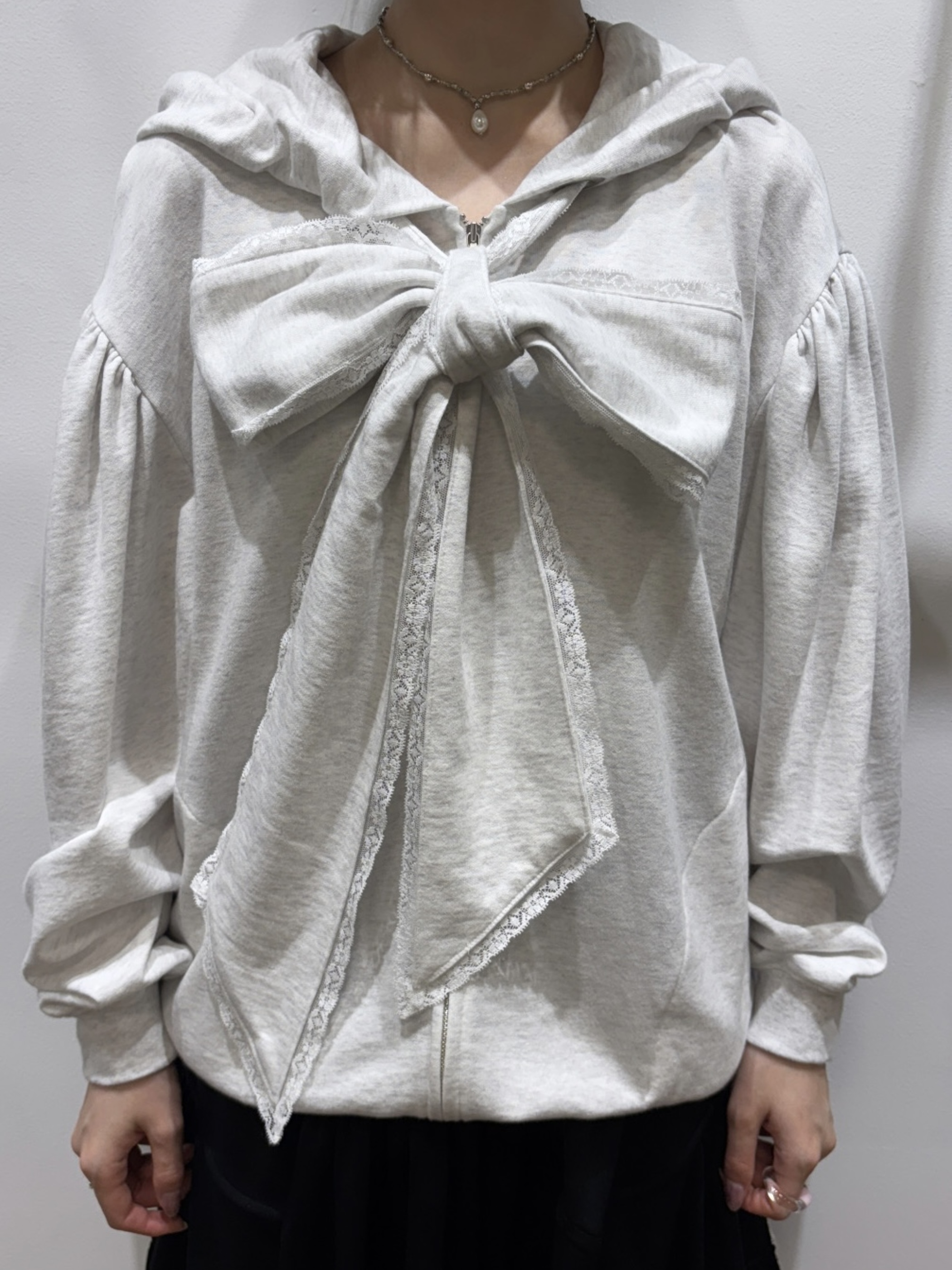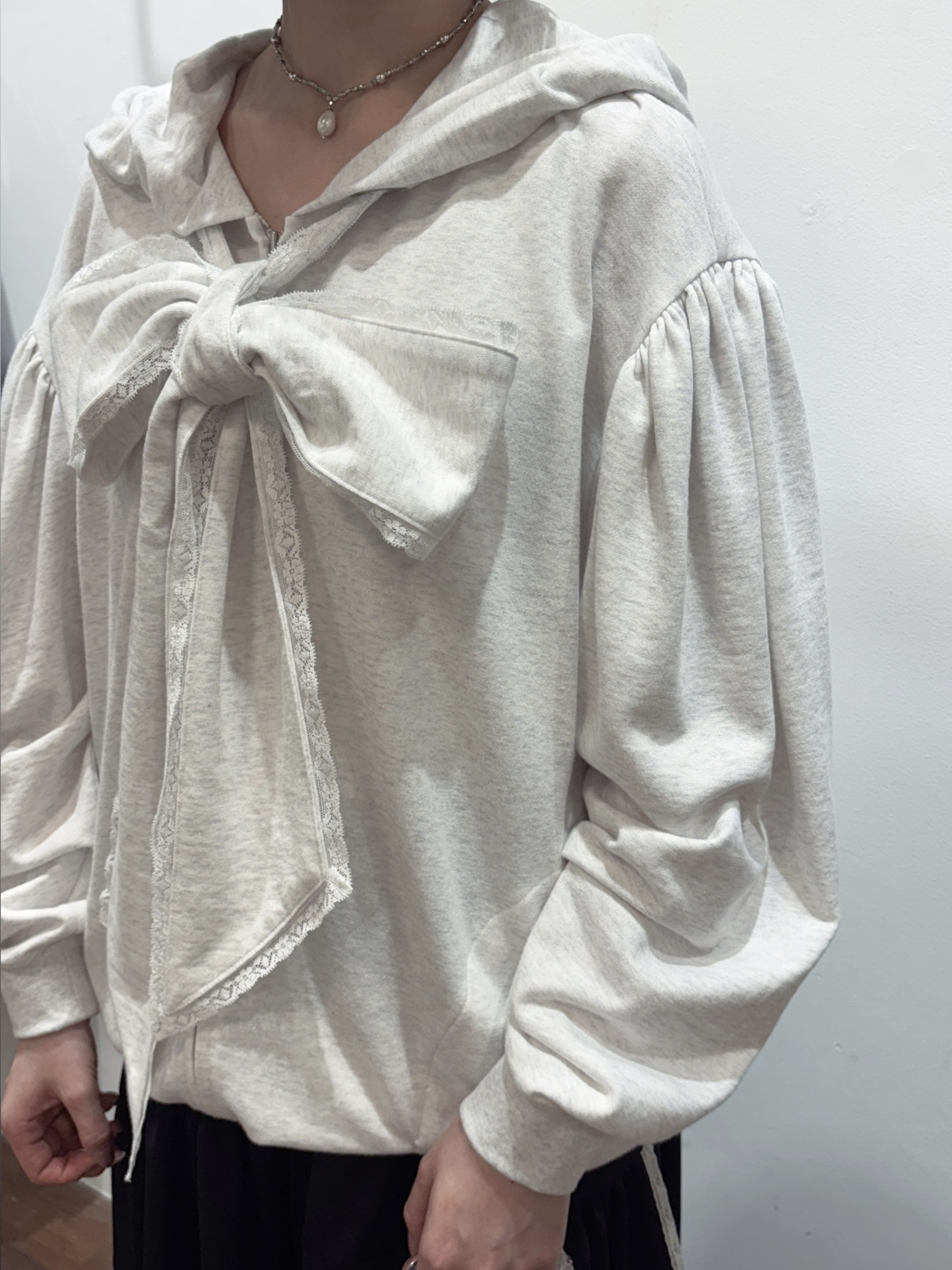 ゆったりとしたシルエットの身頃とたっぷりとボリューム感のあるお袖でリラックスなムードに仕上げながらも、華奢なレースをほどこした大きなリボンで、柔らかな女性像を彷彿させるような仕上げに。