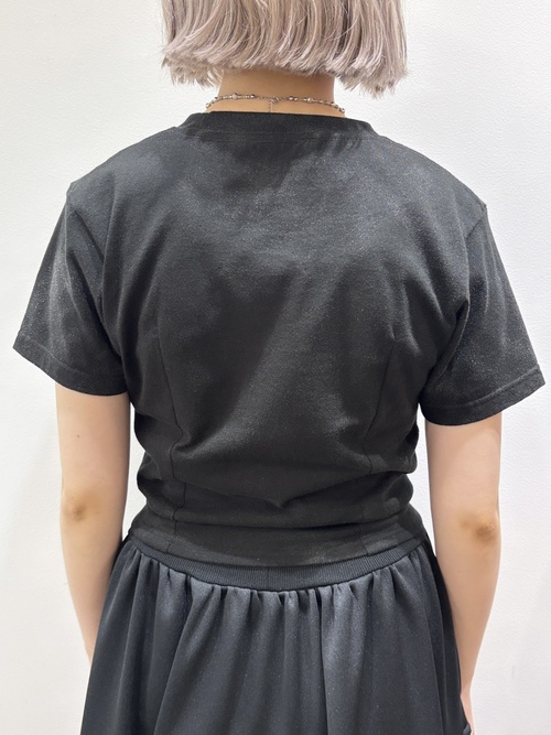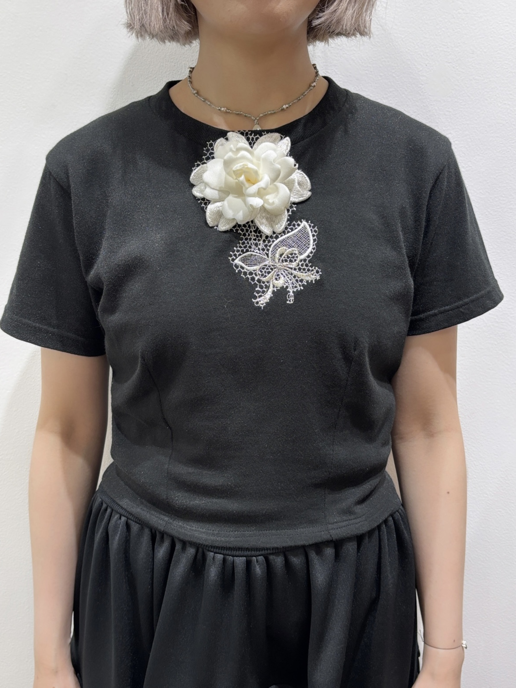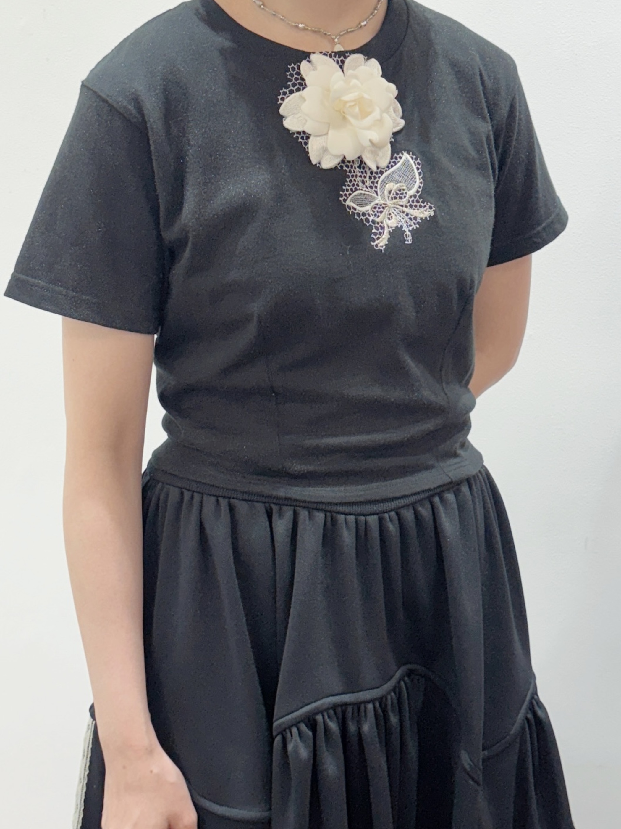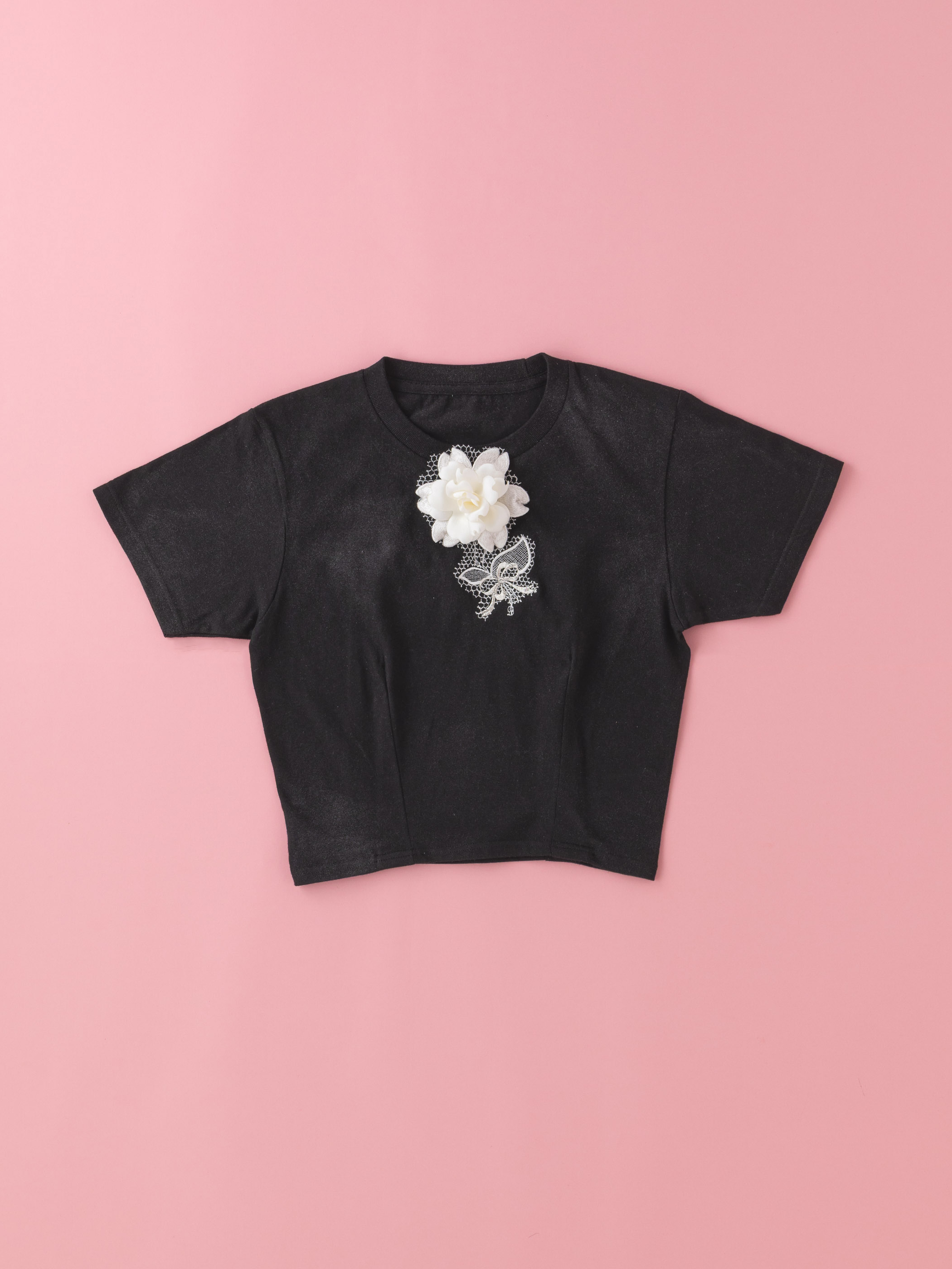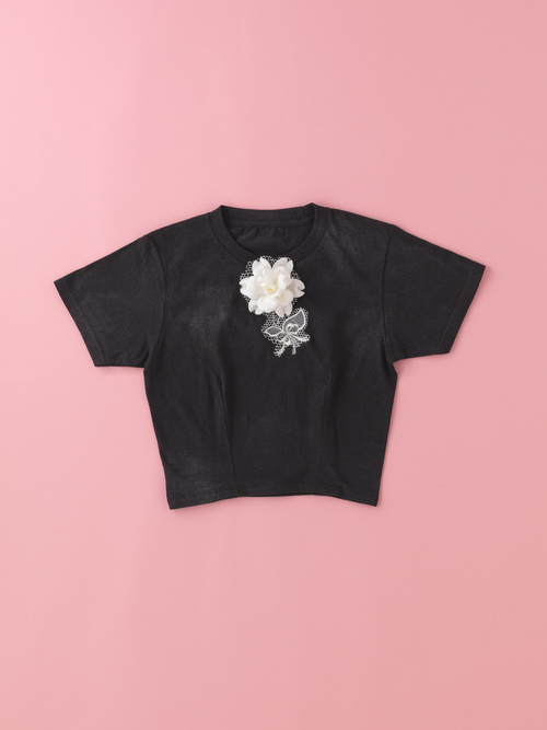 レースが立体的になったようなディテールをワンポイントにしたチビTシャツ。