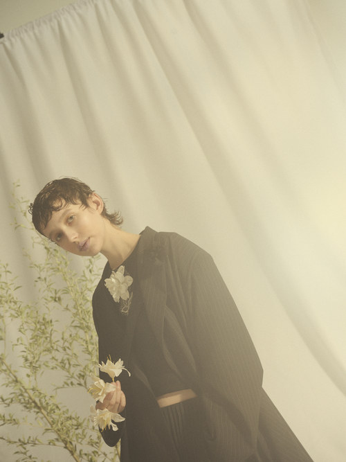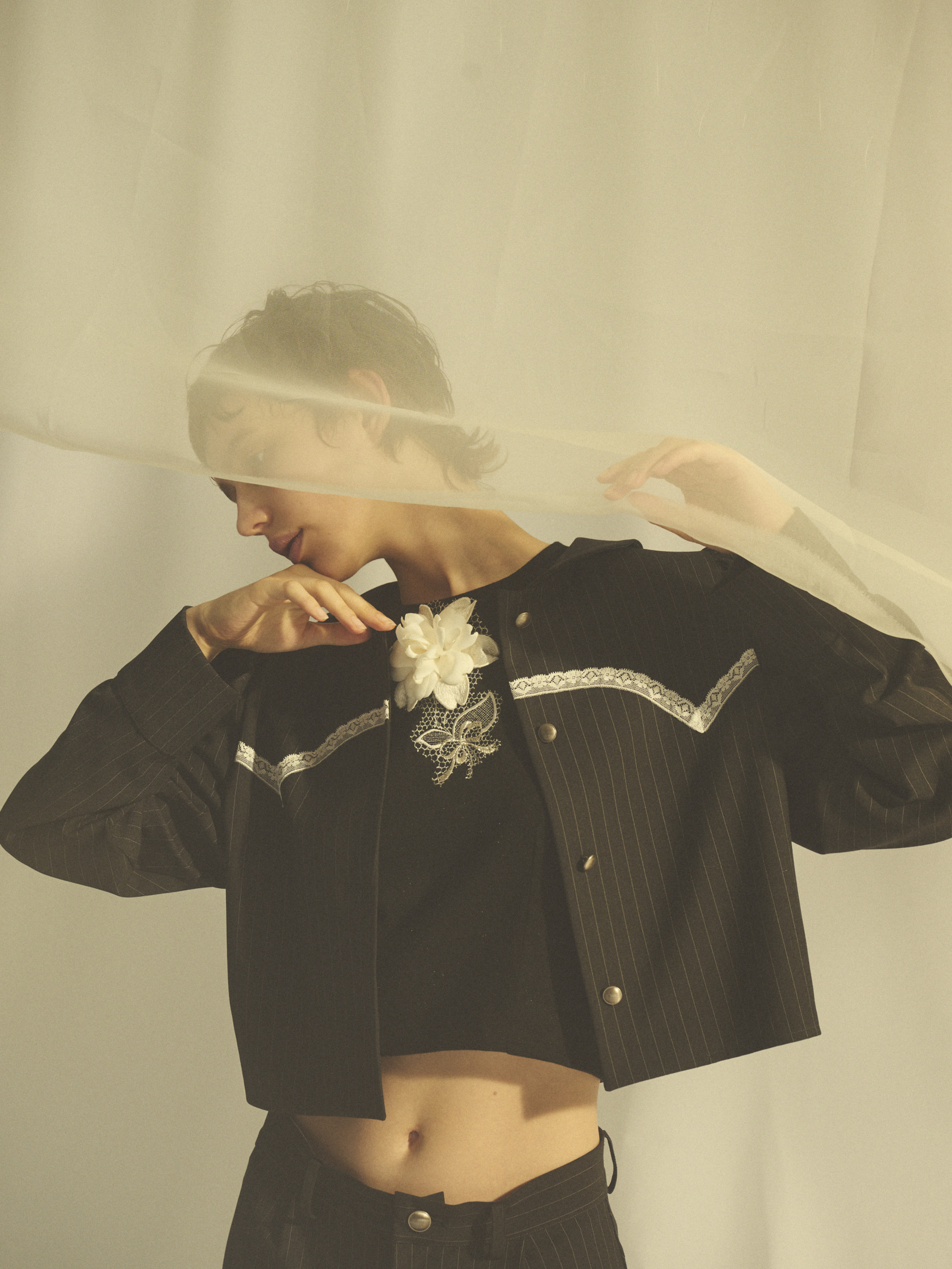 レースのネット部分は刺繍をほどこし、外回りの花びらもそのまま刺繍が浮き立って見えるように糸を何層にも重ねたワッペンの手法で表現。中心のお花は手作業から生まれた布地のお花のコサージュでよりしなやかな表情に