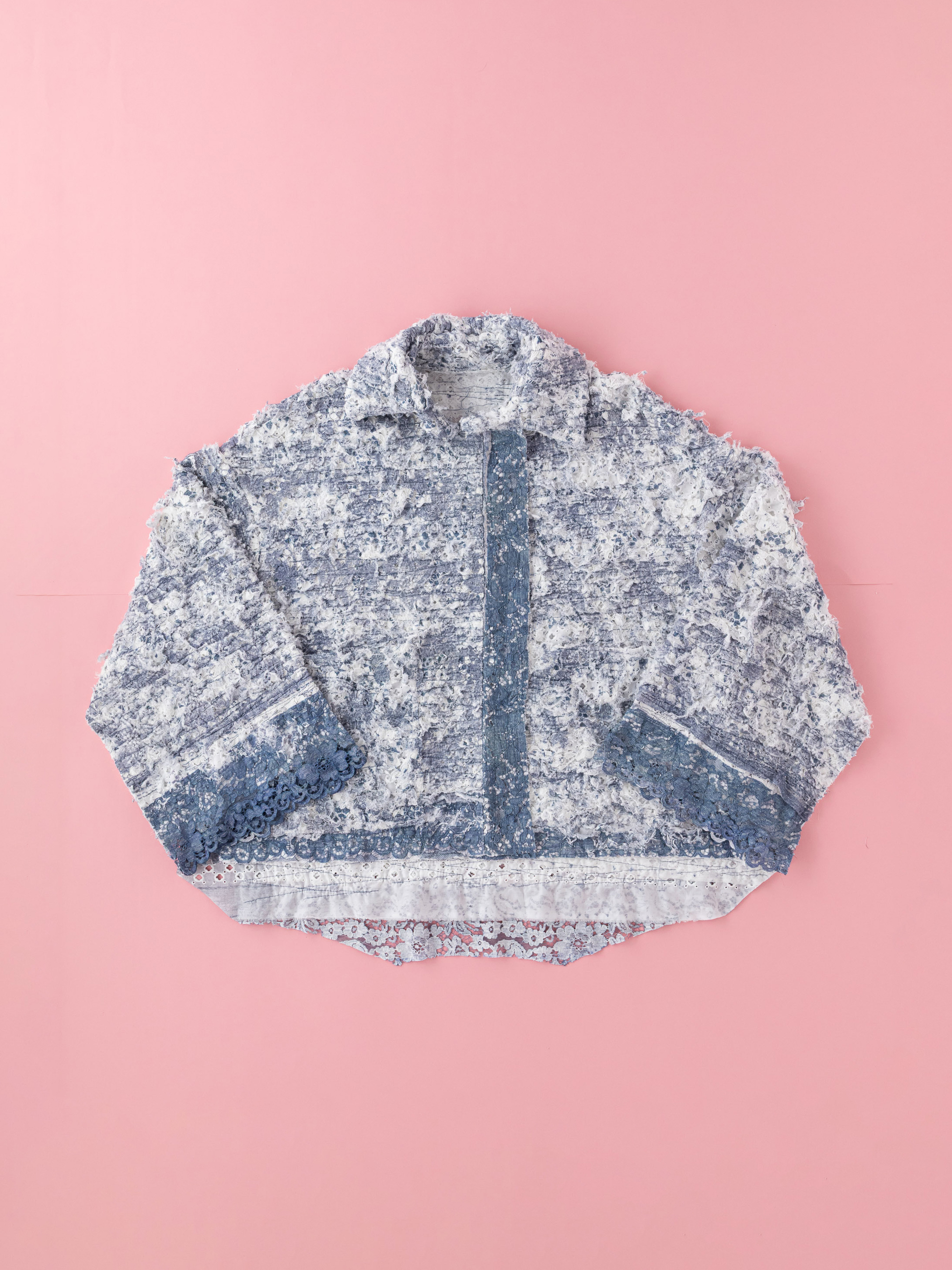 ブルーは4種類、ブラックは3種類のレースを重ね合わせた上からデニムの柄のプリントを重ね、