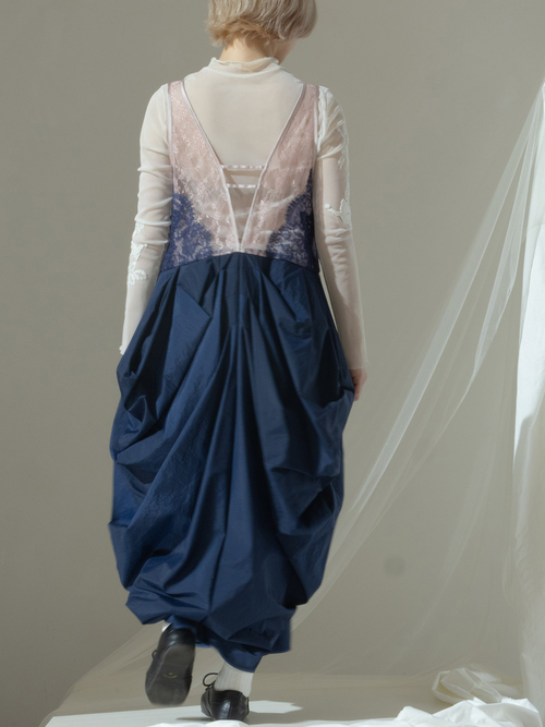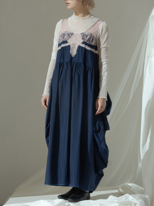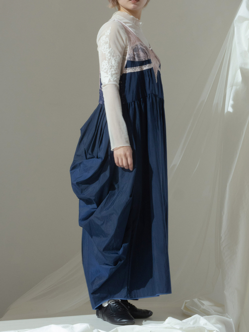 スポーティーなナイロン素材をoverlaceらしいロマンティックなドレスへと昇華した1着。