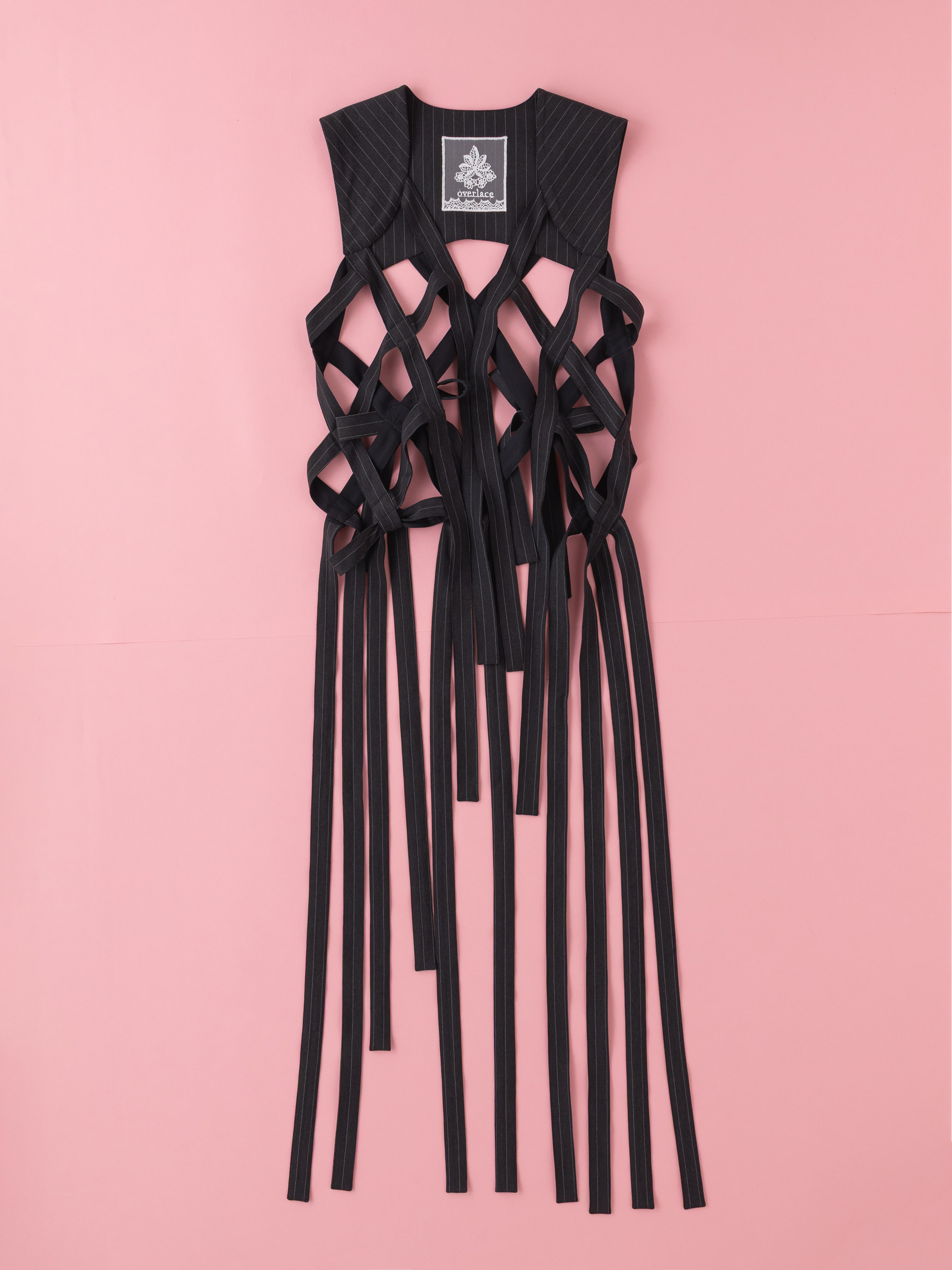 テープ状にした生地を格子状に重ね合わせながらシルエットを構築し、唯一無二のアクセサリーのようなベストが生まれました。
