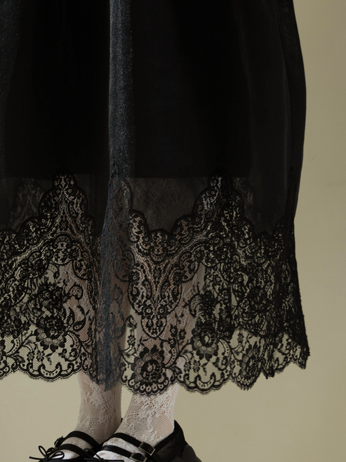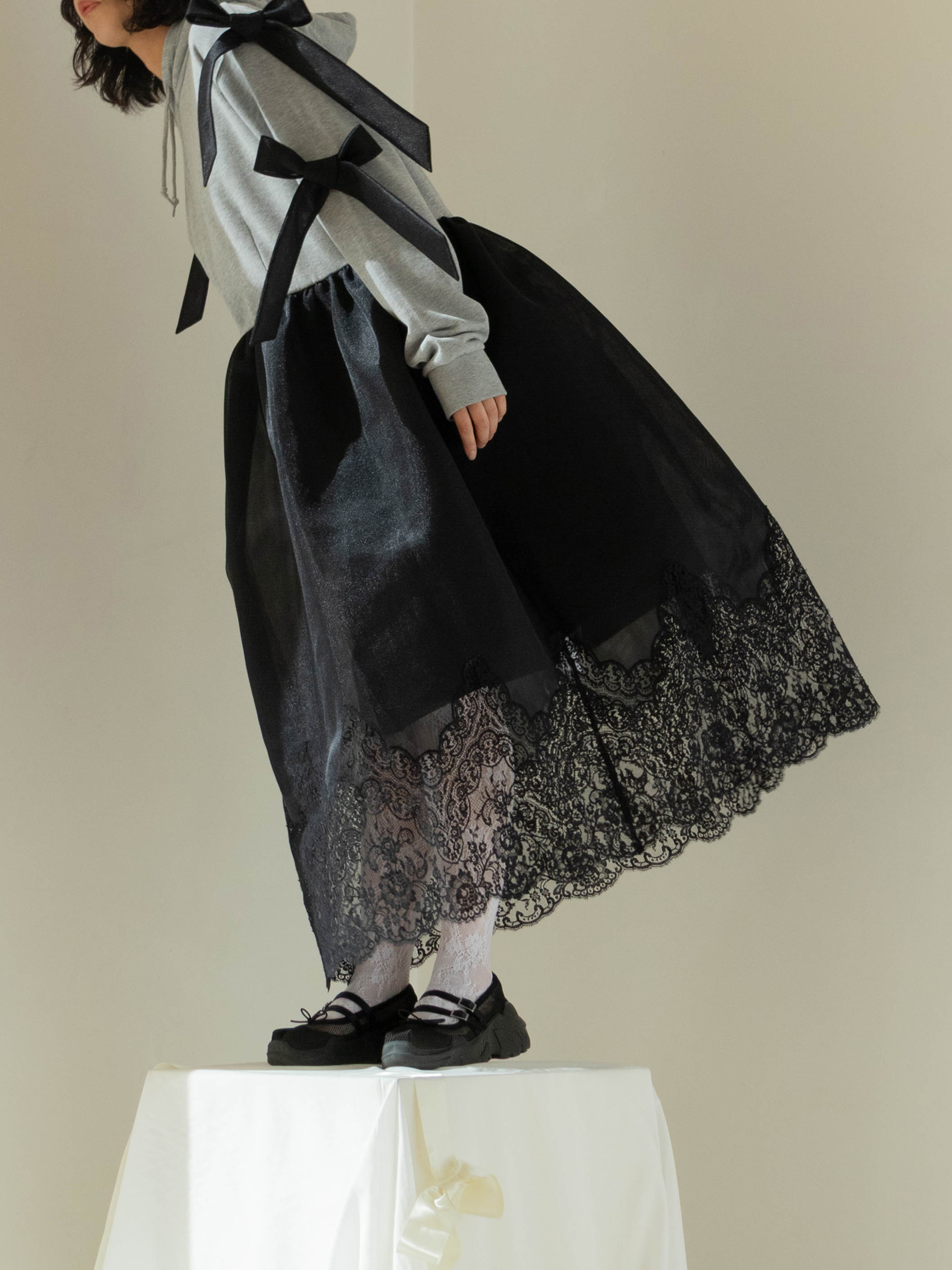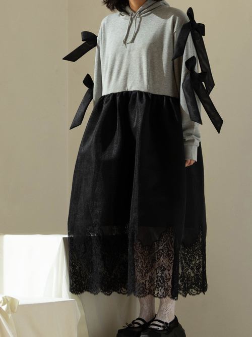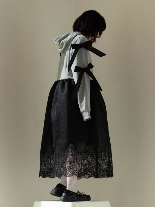 A dress that transforms everyday moments into something dramatic, combining a casual hoodie with a voluminous skirt. The hem is lavishly adorned with French river lace, creating the delicate impression characteristic of overlace.