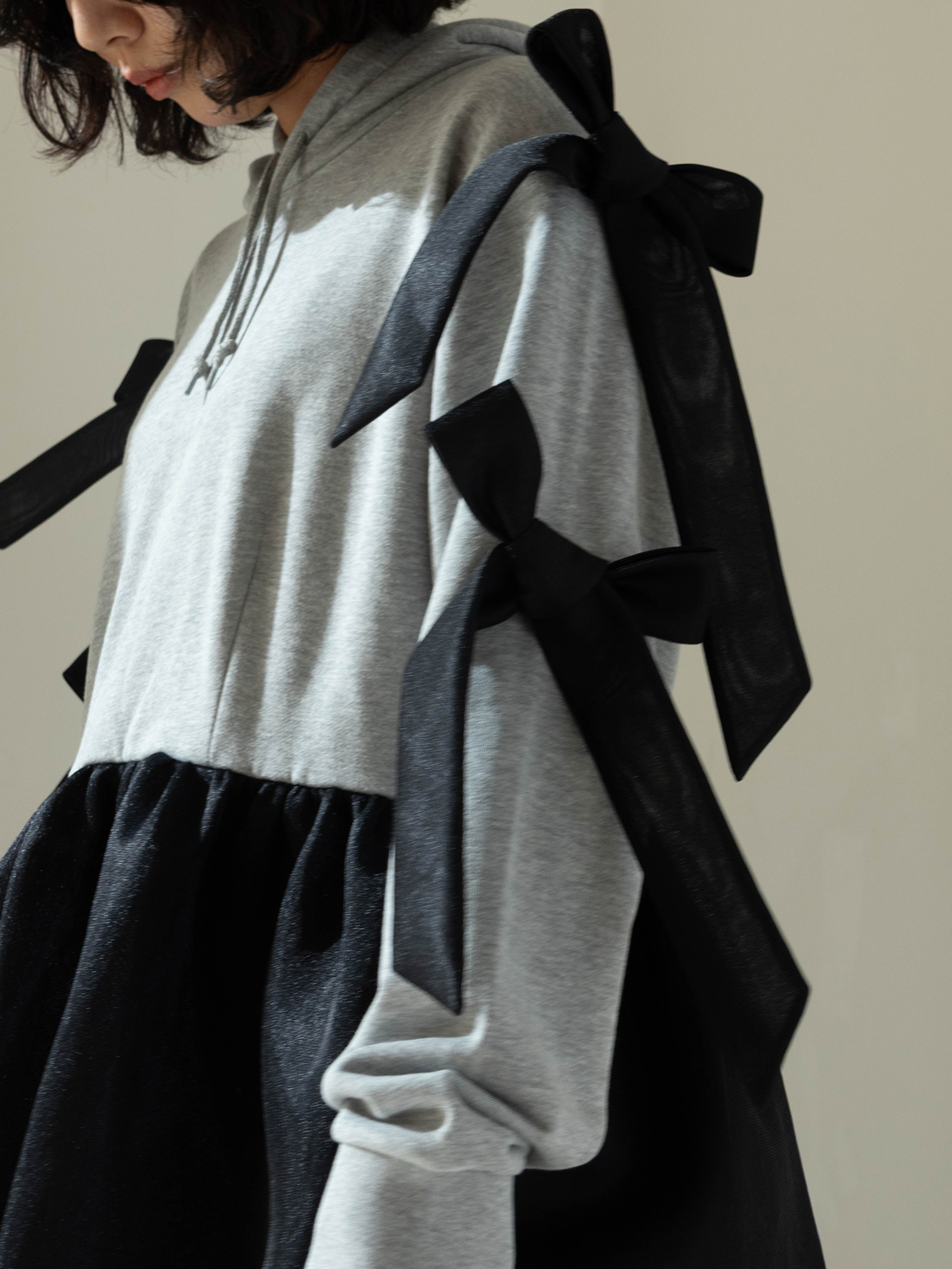 Four three-dimensional bows on the sleeves catch the eye, guiding you toward an adorable presence. It's a dress you can comfortably wear all day, yet it also feels like a special outfit.