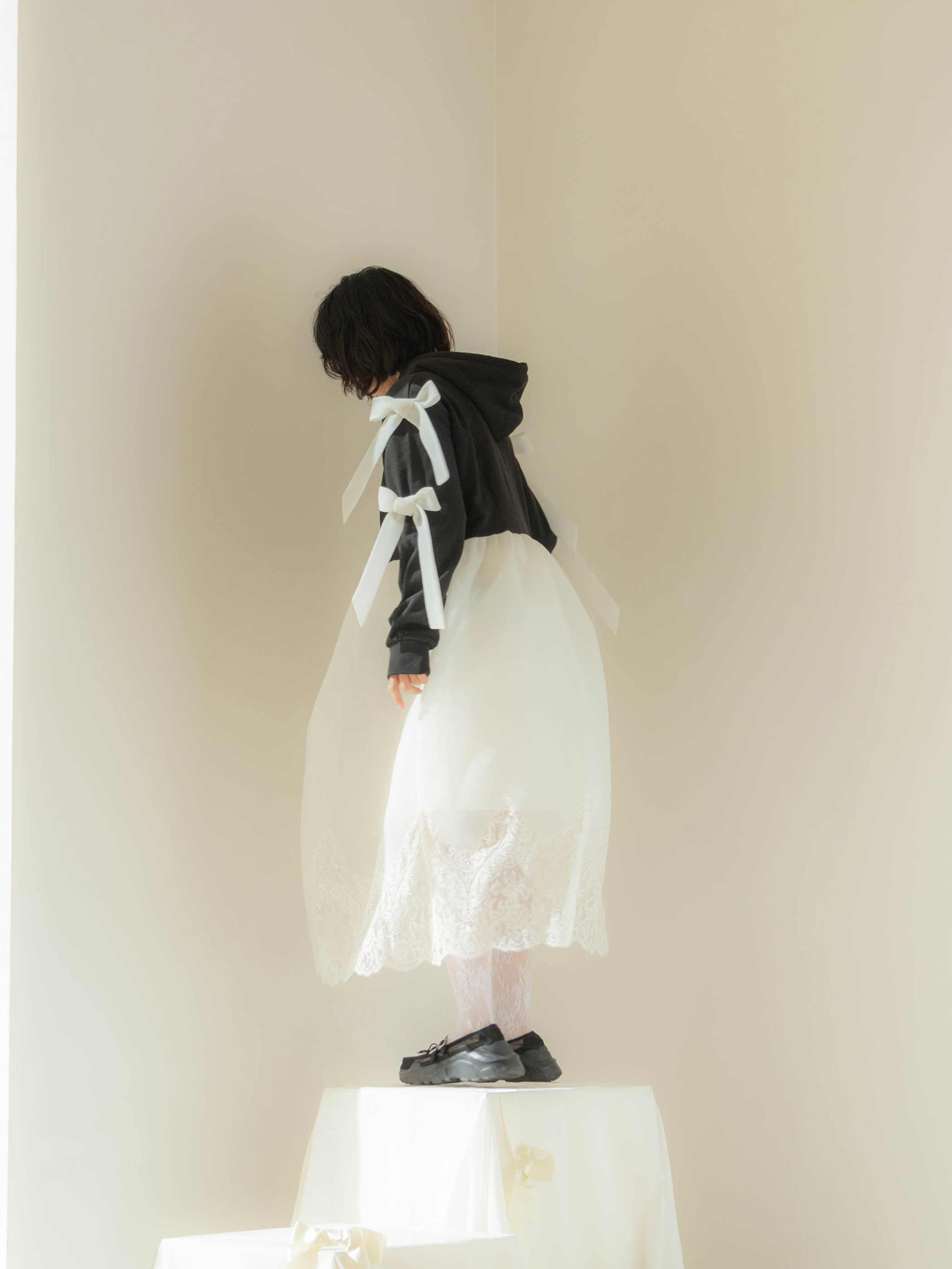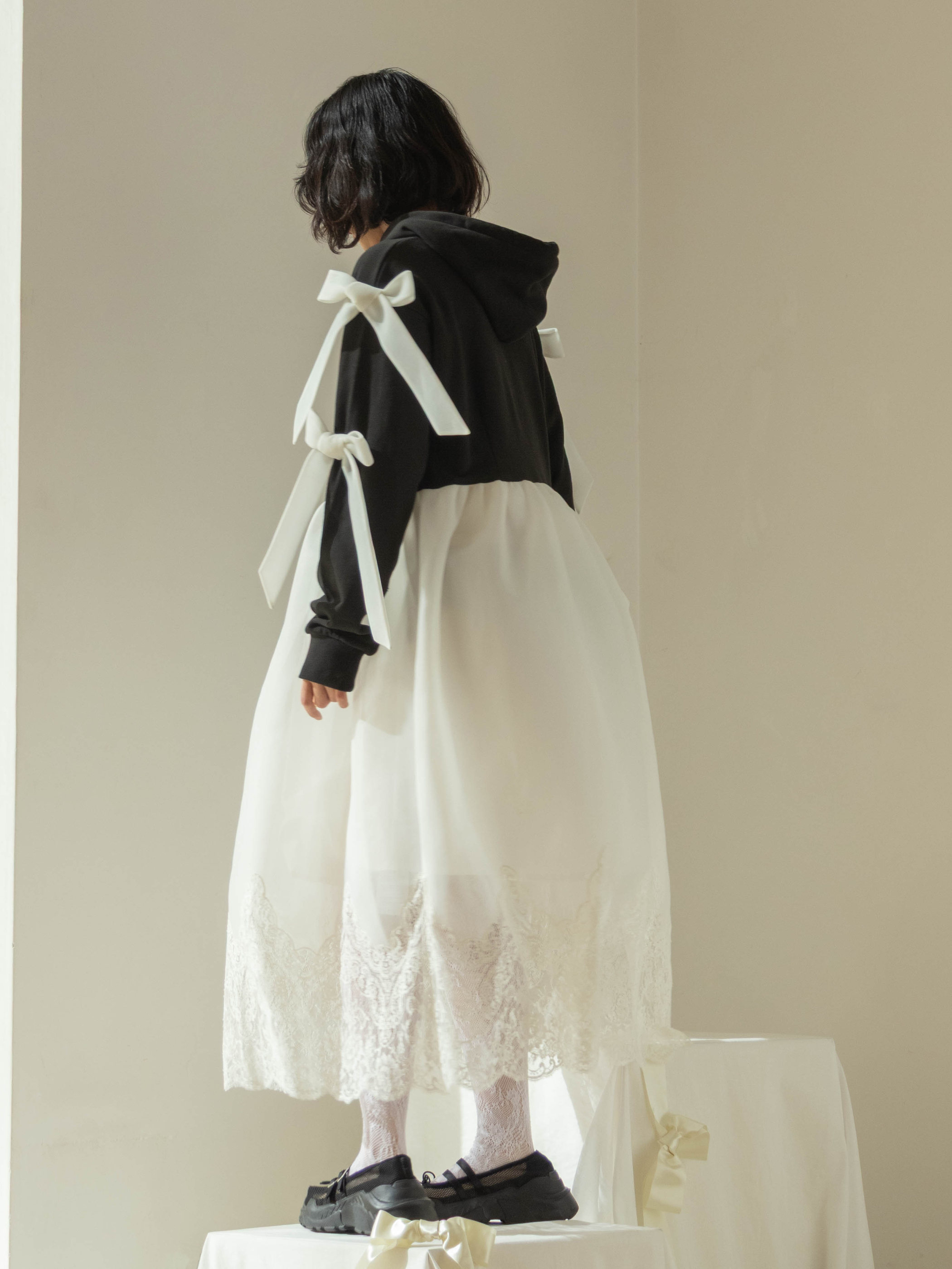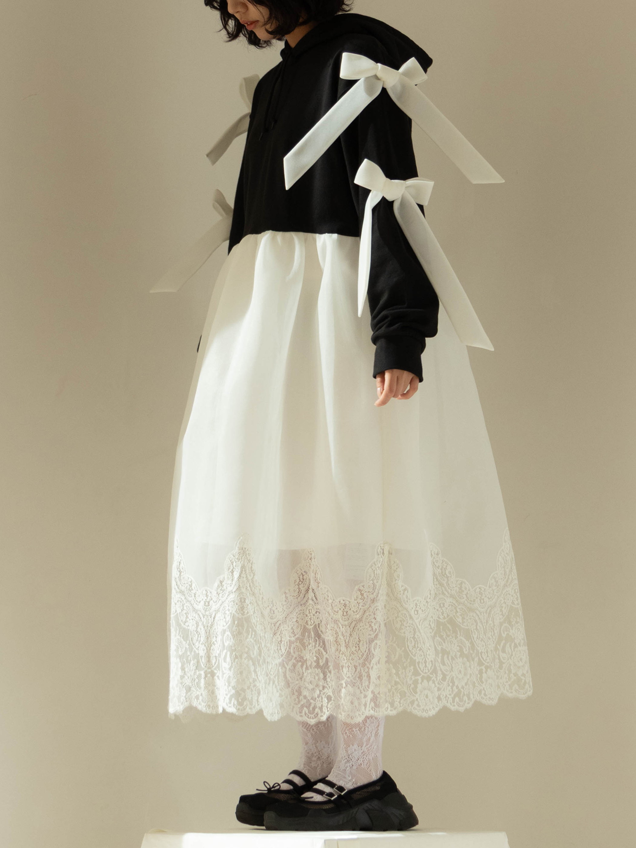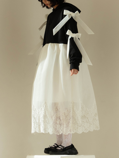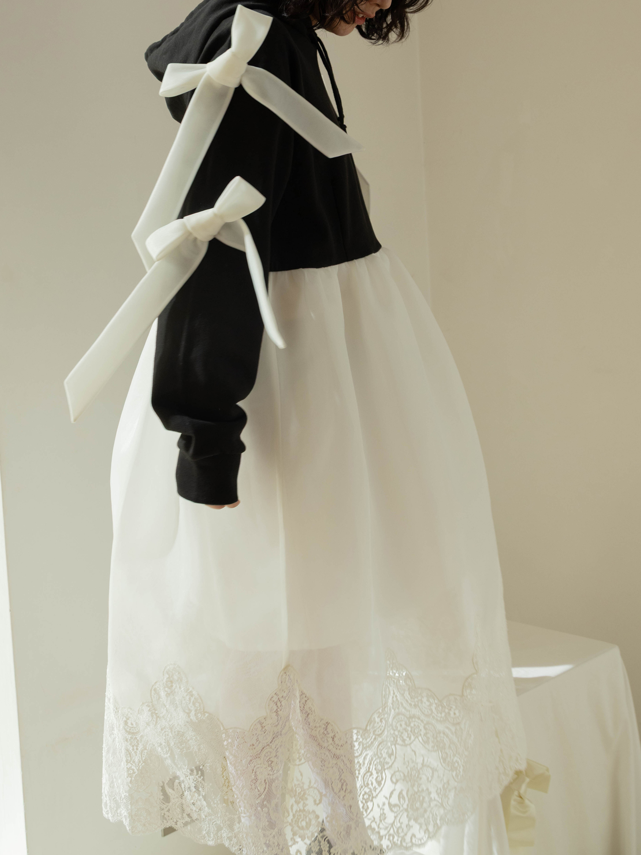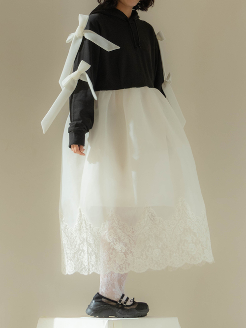 A dress that transforms everyday moments into something dramatic, combining a casual hoodie with a voluminous skirt. The hem is lavishly adorned with French river lace, creating the delicate impression characteristic of overlace.