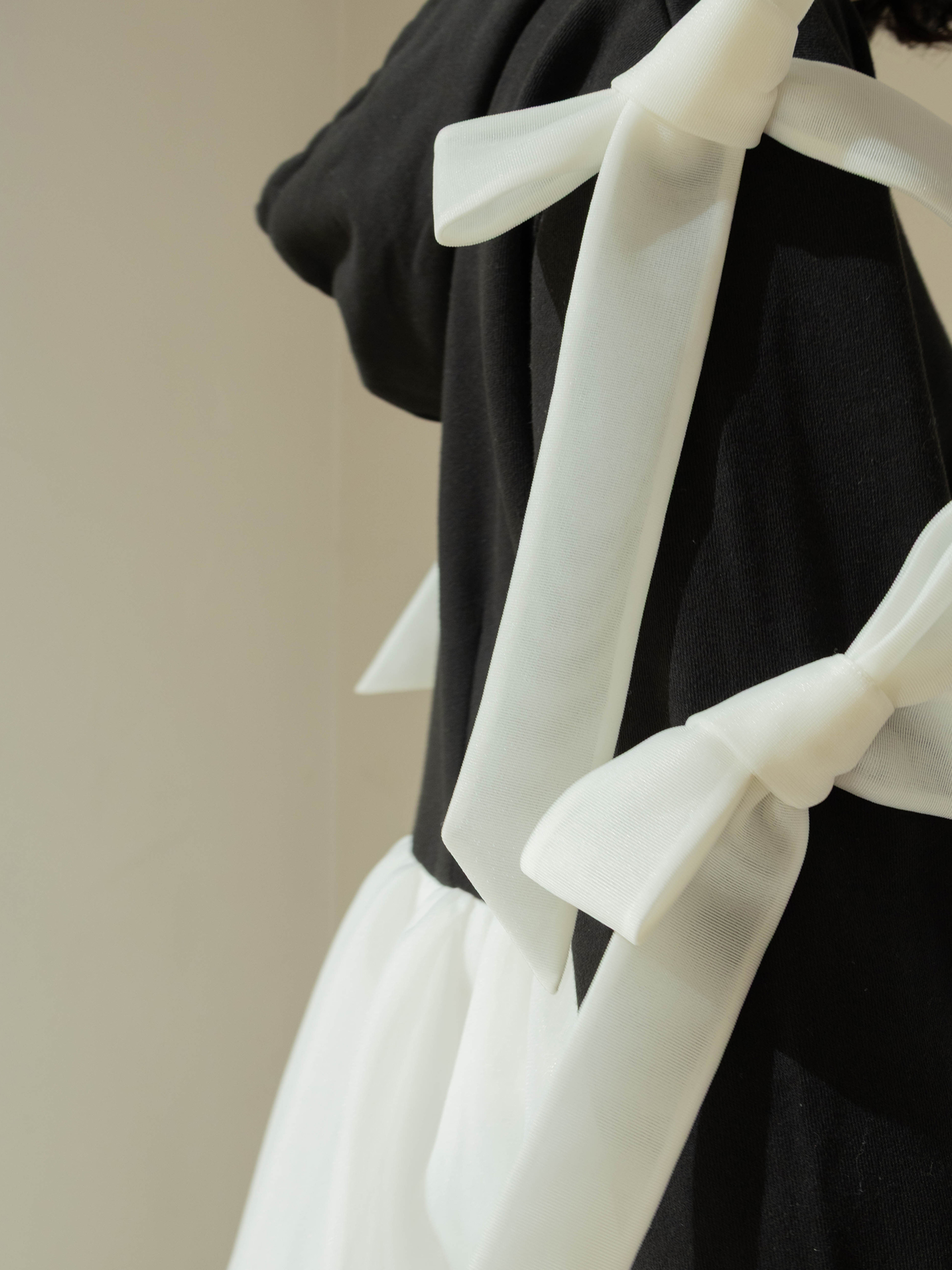 Enjoy color blocking: Oatmeal features a pristine off-white skirt and ribbons; Gray pairs with a chic, sophisticated black skirt and ribbons; Black comes with an off-white skirt and ribbons.