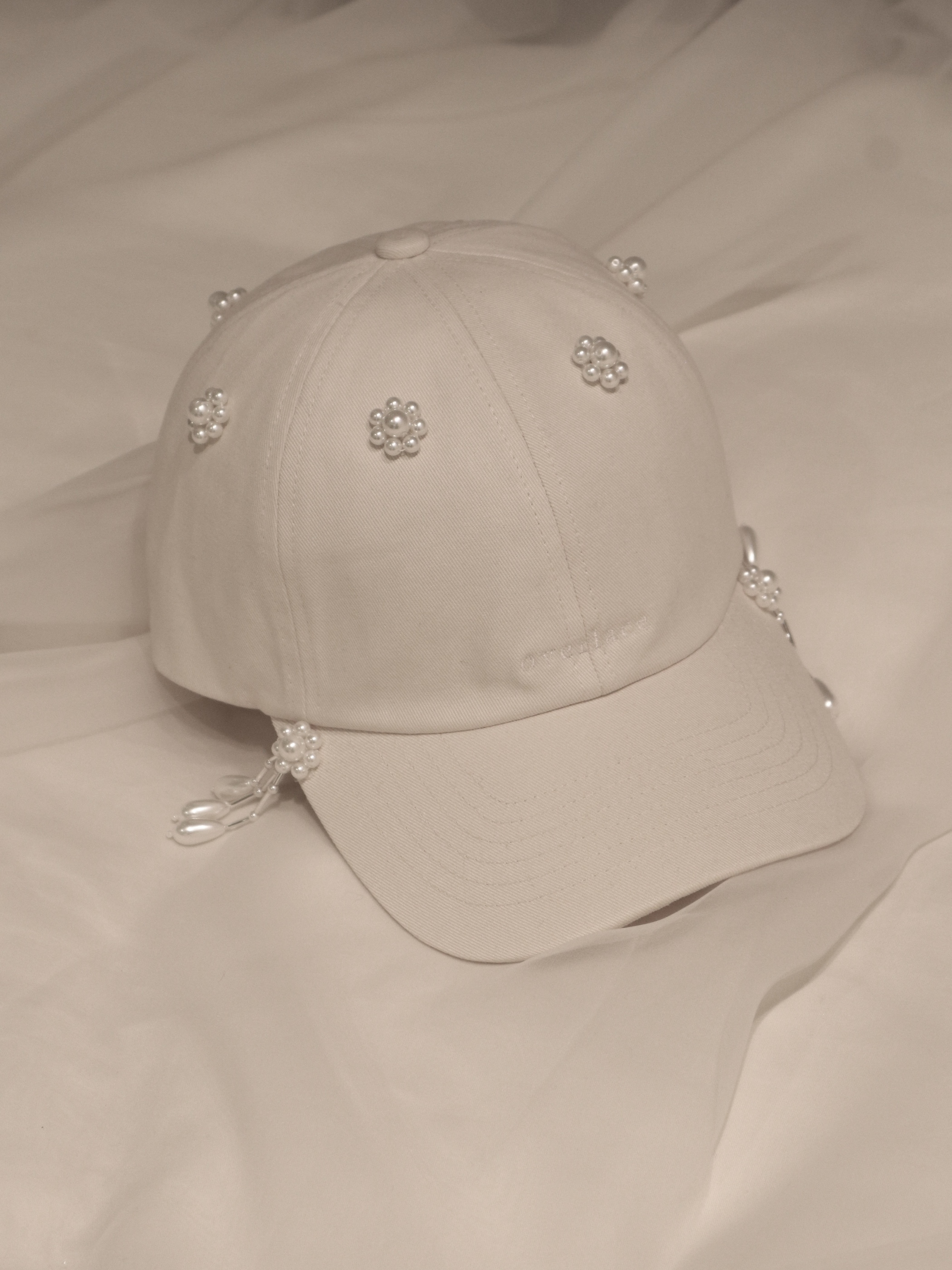 パネルごとにあしらわれたフラワービジューが、360°どの角度から見ても、華やかな印象を与え繊細な手仕事が際立つキャップです。
