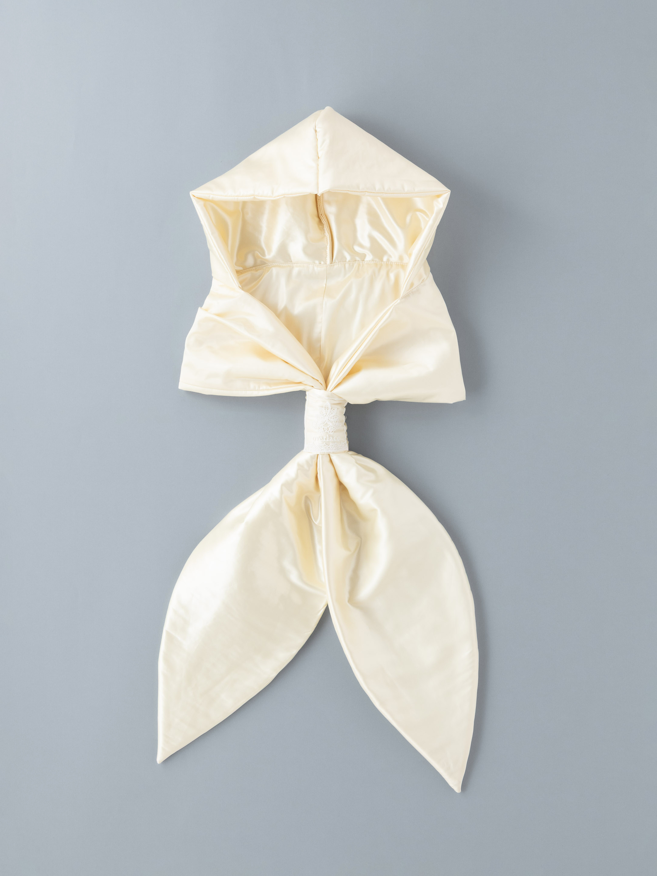 装いに余白と印象を添える、静かな主役のワックス加工を施したサテンのほのかな艶を纏ったフード付きのリボンマフラー。