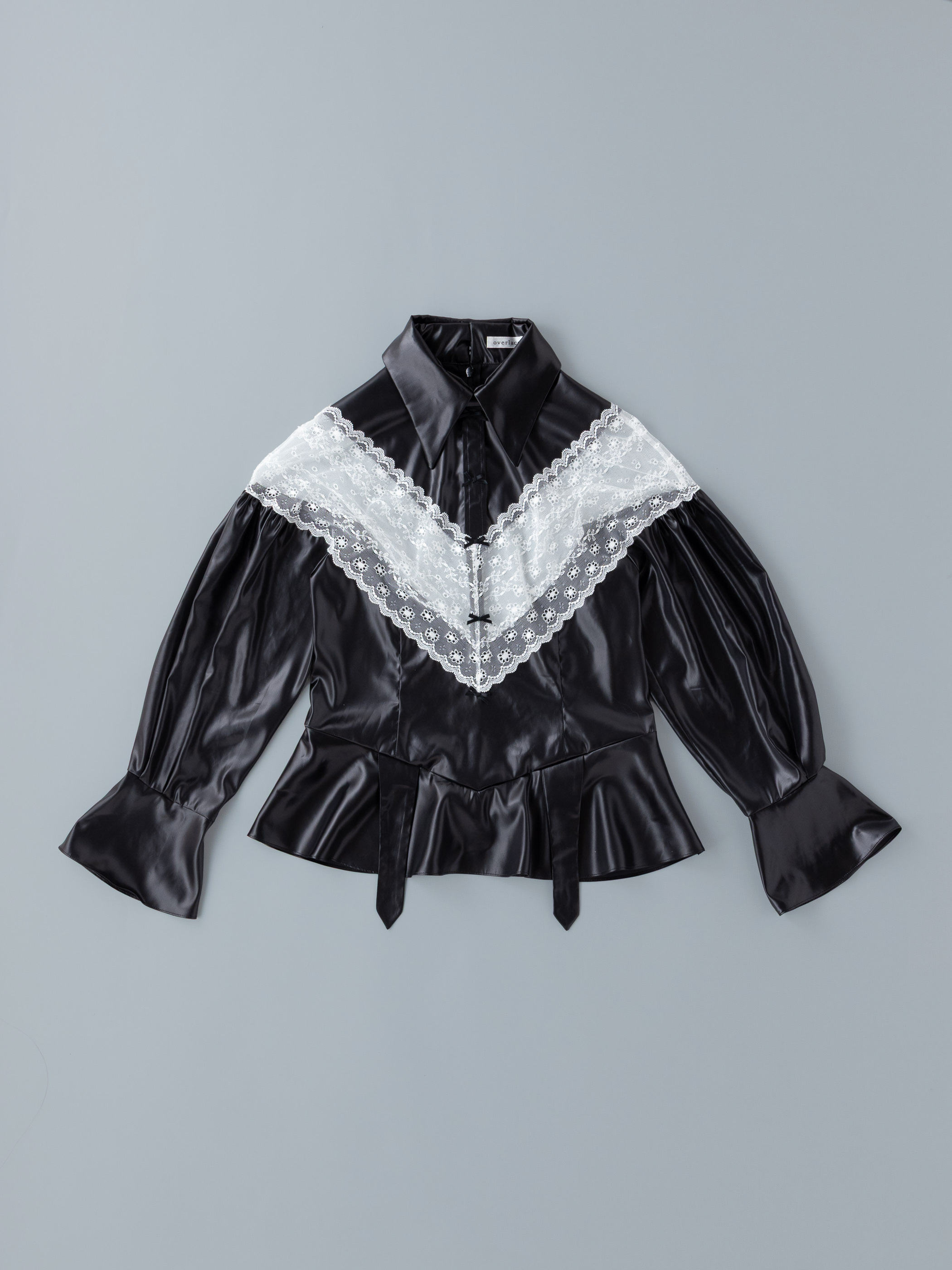 フロントにはランジェリーに見られる切り替えの構造を引用したデザイン。V字に重なるレースが身体のラインをなぞるように配置され、どこか親密で繊細なムードを漂わせます。
