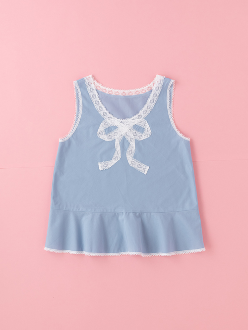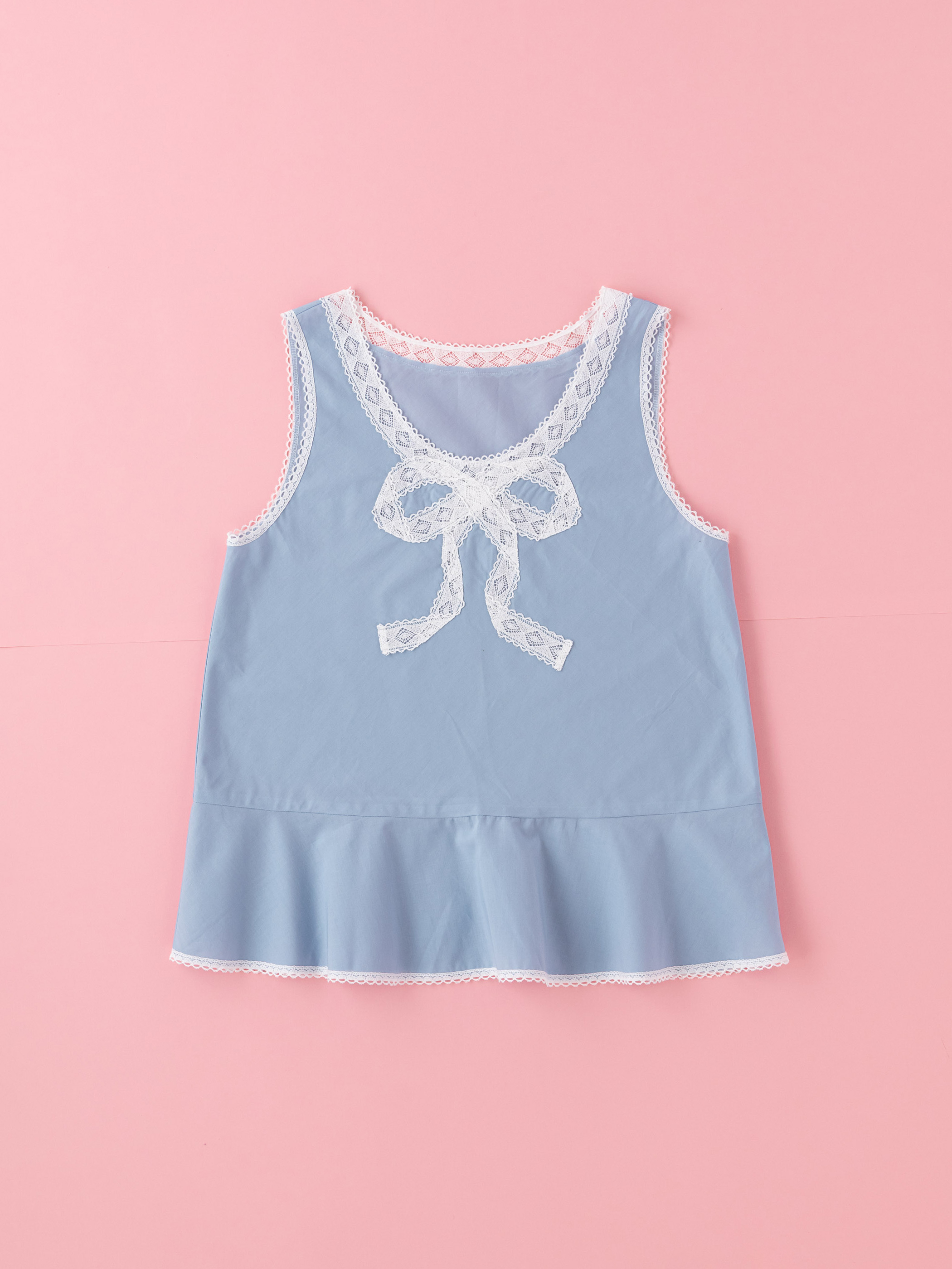 This sleeveless blouse features a striking, adorable ribbon motif. Delicate lace adorns the cuffs and hem, while bold lace brightens up the chest and collar.
