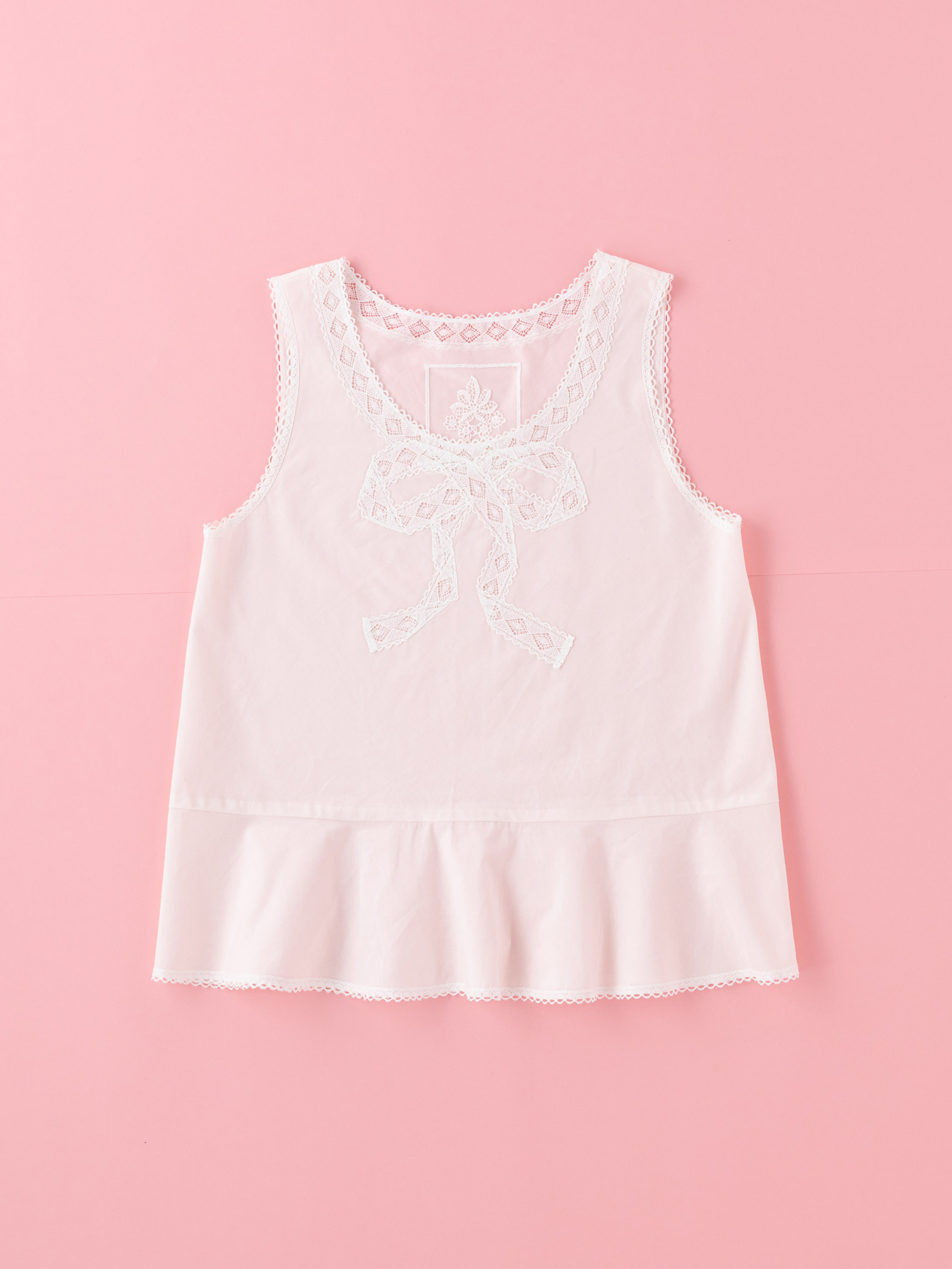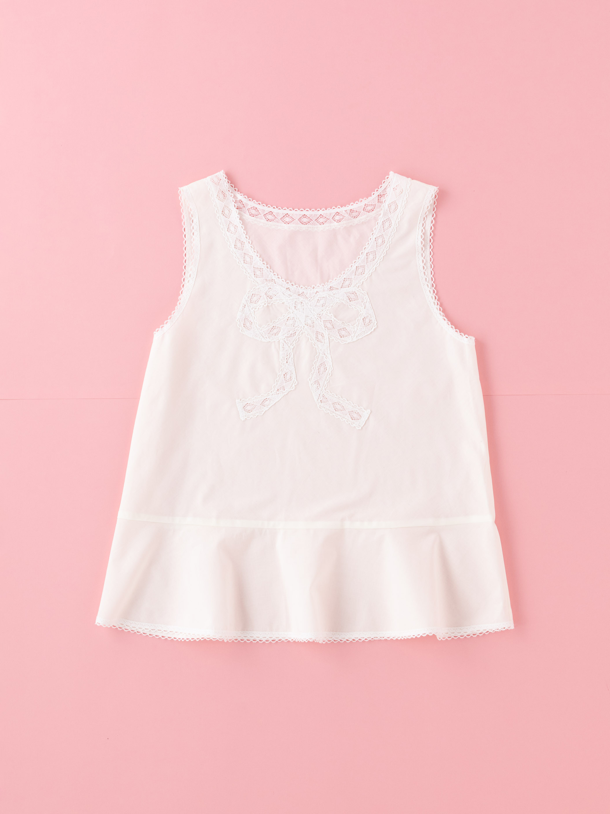 愛おしいリボンのモチーフが印象的なノースリーブブラウス。華奢なレースで袖口と裾を彩り、大胆なレースで胸元と衿周りを華やぎました。