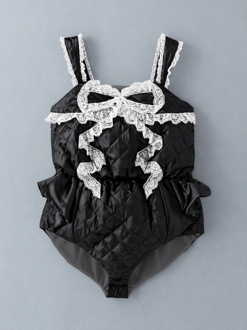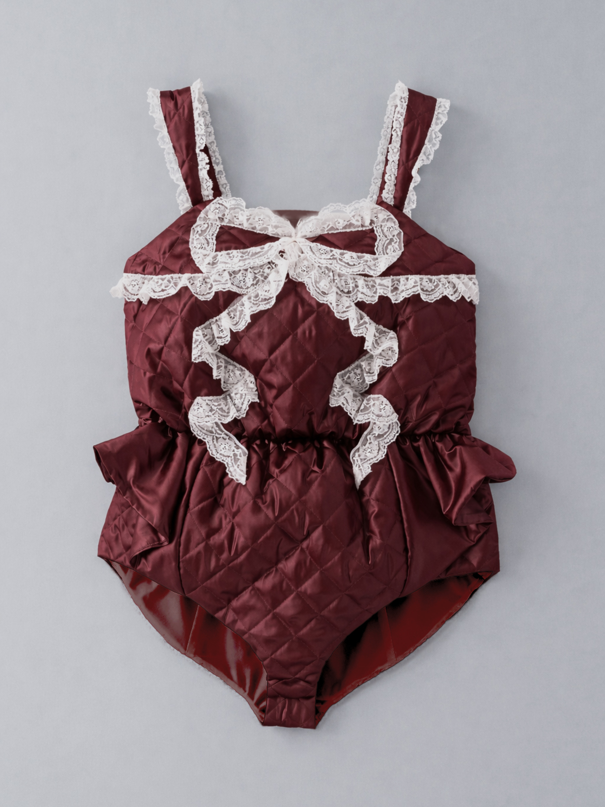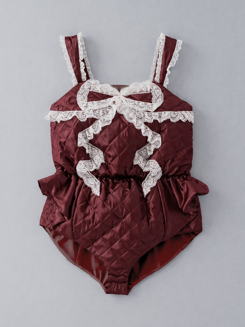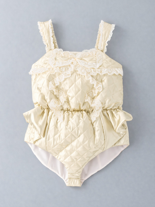 本来は肌に寄り添うためのテディを、あえてキルト素材で再構築することで、装いとして成立させた一着。柔らかな光沢を湛えたピンクベージュのボディに、立体感のあるダイヤキルトが奥行きを与え、甘さの中に確かな存在感を宿します。
