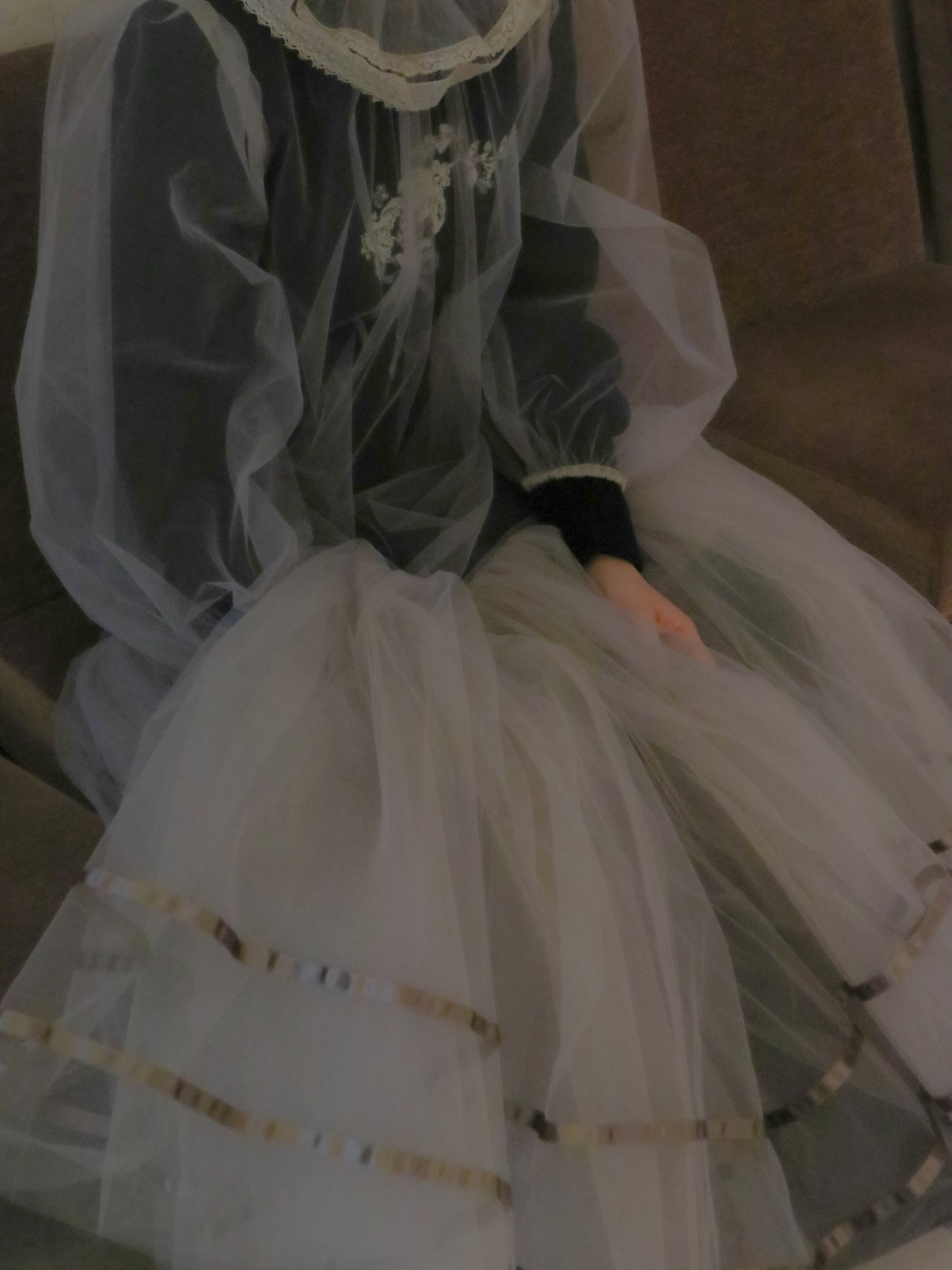 胸元には繊細なリバーレースとビーズ刺繍をあしらい静かなきらめきを添え、甘さを抑えたデザインの中でさりげなく視線を引き寄せます。