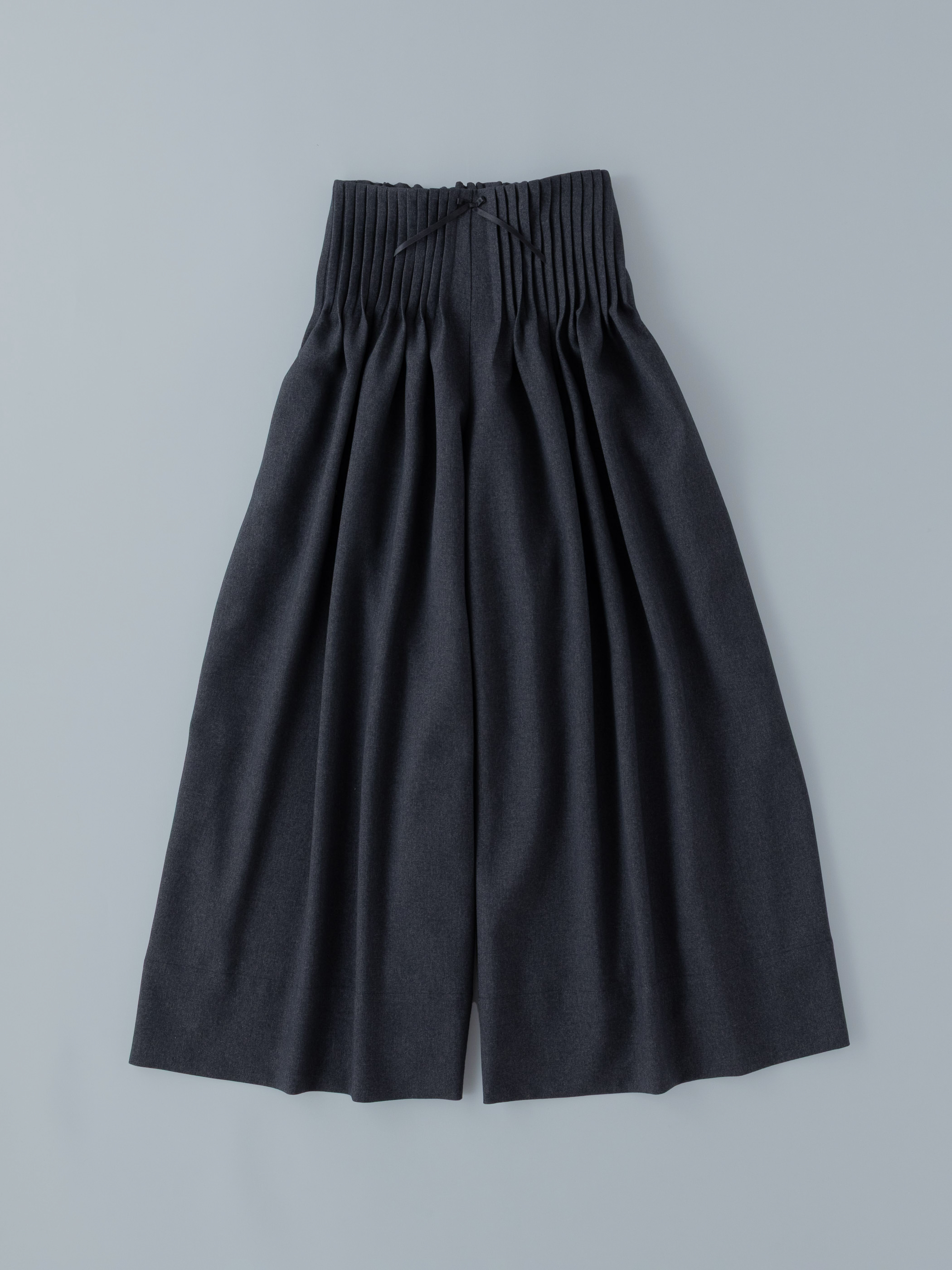 コートやベストと同素材で仕立てることで、凛とした統一感を持ちながらも、より自由でしなやかな動きを描きます。